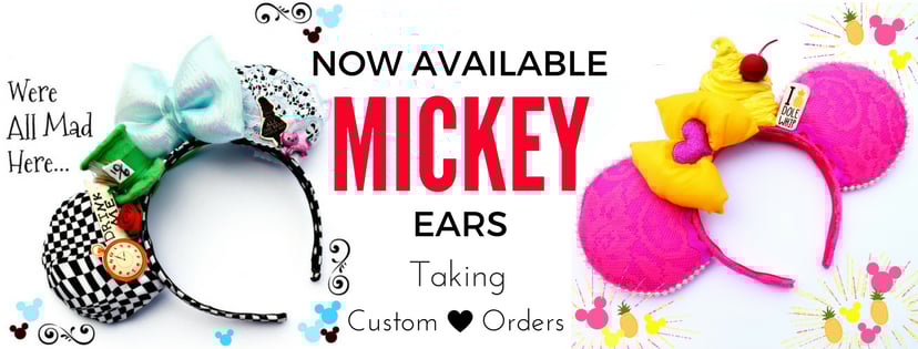 Classic scenes from the original movie set the backdrop for these ears. The crows fly and swirl around the tent and train while Timothy Q. Mouse commands the act from atop the mini Dumbo hat while holding the iconic black feather. Sweet baby Dumbo made of felt centers the red and white star-studded bow. Pink trim surrounds the circus and whimsical chevron backs these ears. WE LOVE this design!